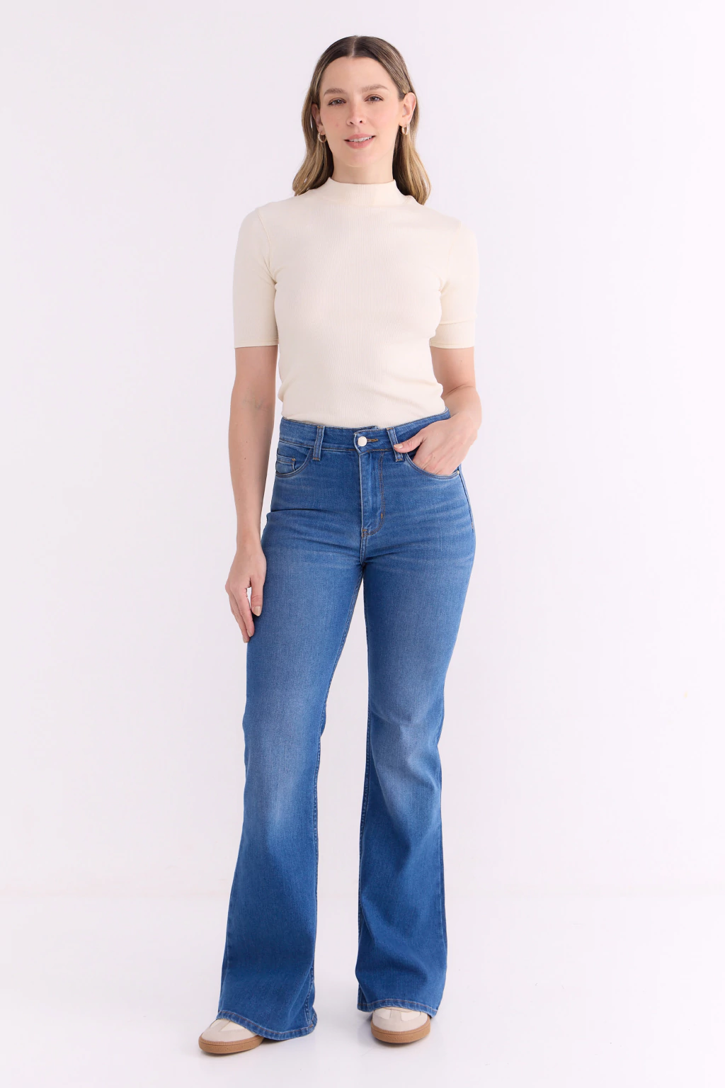 Jean confeccionado en denim de calce cómodo, con tiro alto que realza la silueta. Presenta pierna ajustada en la parte superior y amplia hacia el ruedo, logrando el clásico corte oxford. Cuenta con bolsillos delanteros y traseros, cierre con botón metálico y costuras visibles que aportan un acabado prolijo. Un básico versátil y atemporal, ideal para looks casuales o más sofisticados según cómo se combine.