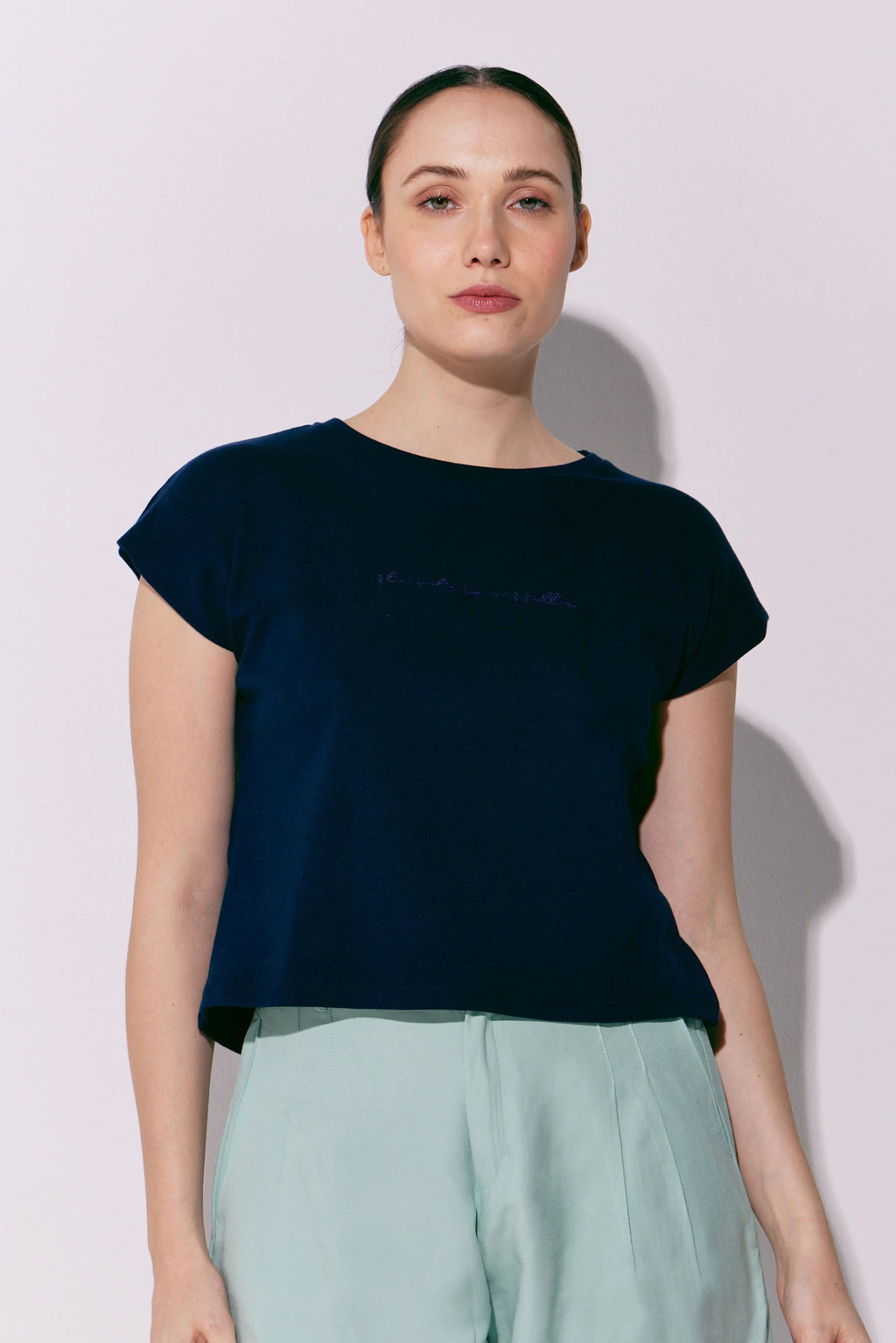 Remera de hombro amplio, confeccionada en tejido liviano y suave al tacto. Presenta un diseño recto y cómodo, con terminaciones prolijas en cuello y sisas. Destaca el arte bordado al frente, que aporta un detalle distintivo y artesanal al diseño. Ideal para un look casual con un toque de estilo.